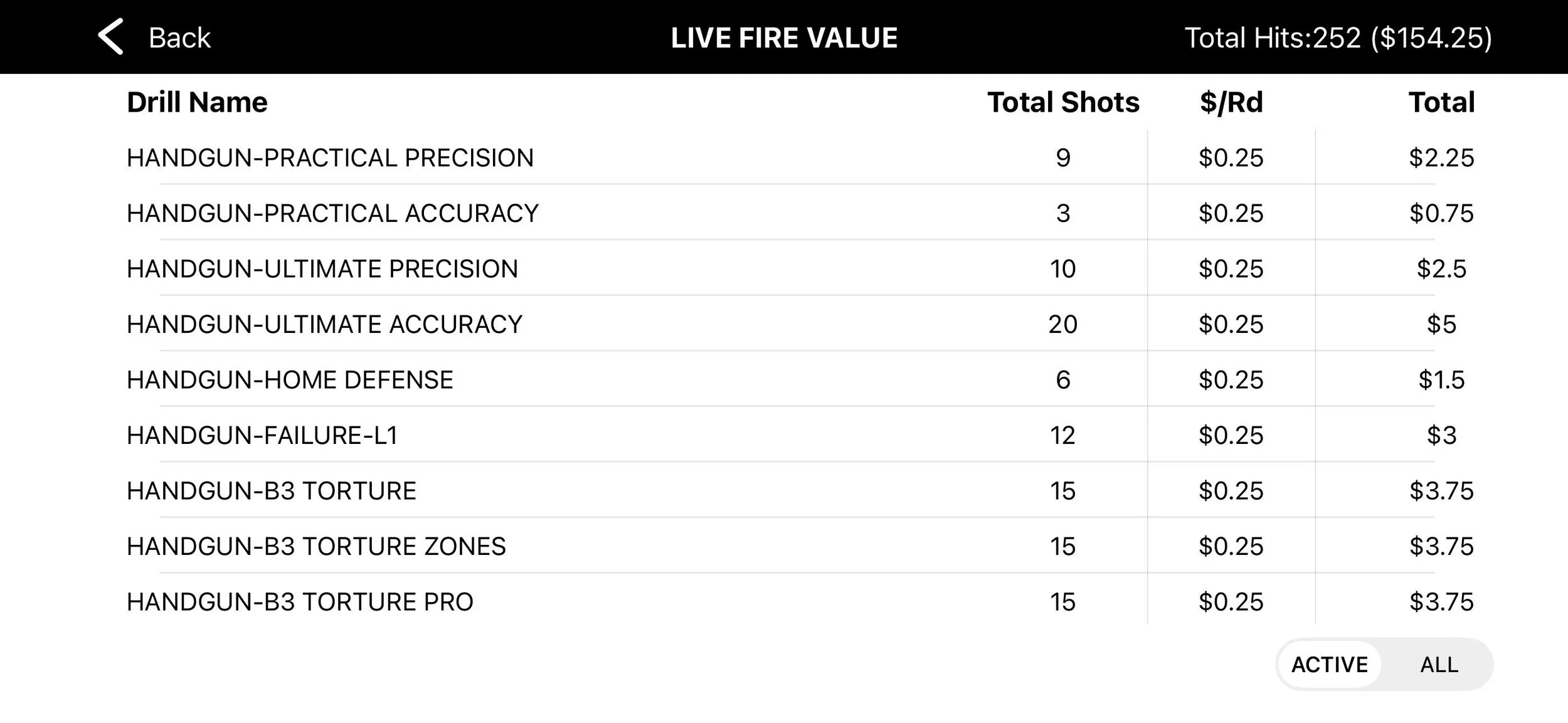 The system keeps a running total of hits and accumulated live-fire value. You can switch between Active drills or view All drills.